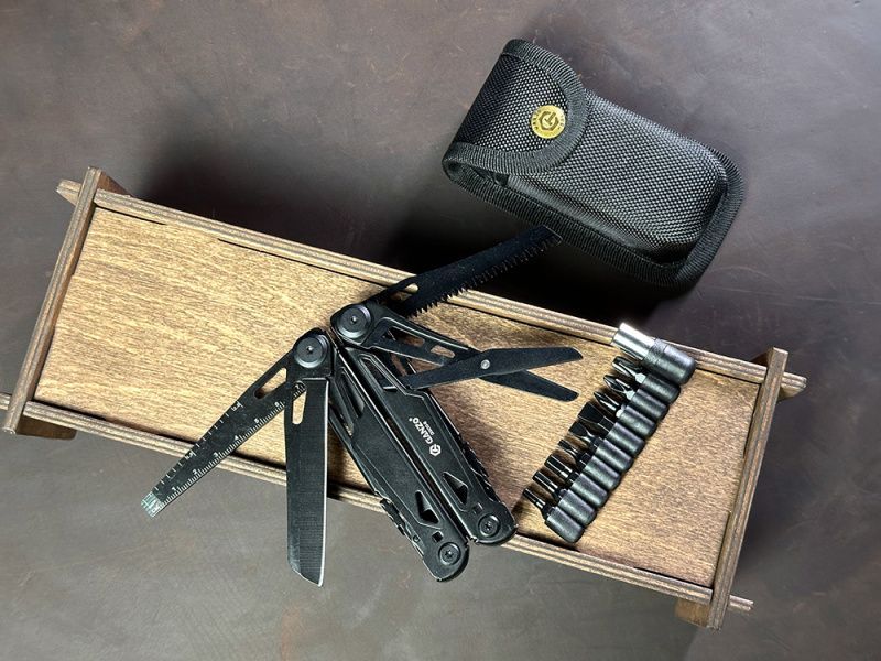 В мультитуле 18 функций: плоскогубцы, кусачки, нож, пила, отвертки, держатель для бит и другие.