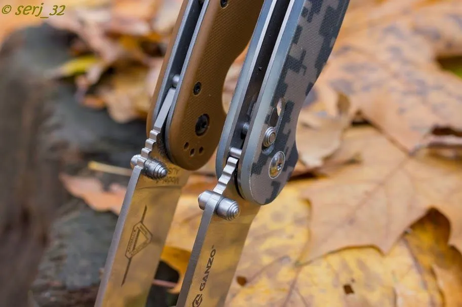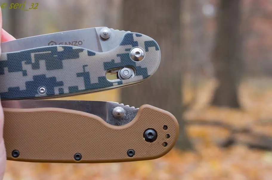 Теперь перейдем к деталям, где и кроется разница. Замок у Ontario это Liner, а у Ganzo — Axis. Если в первых сериях ножей Ganzo, когда компания только появилась на рынке можно было говорить, что качество замков может быть лучше, то теперь компания учла ошибки. Замок работает все так же надежно, а главное — плавность хода блокирующего штифта стала выше.