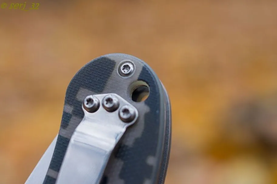 Проставочные шайбы на оси клинка латунные у обоих ножей. Клипса у Ontario может быть расположена в четырех позициях, а у Ganzo предусмотрены только две.
