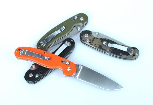 Ручка ножа тоже сделана из материалов высокого качества. Накладки на металлическую основы изготовлены из стеклопластика G10, который является износостойким композитным материалом с хорошей стойкостью к различным видам коррозии. Стеклопластик легко окрашивается, так что покупатели могут выбирать данную модель ножа в четырех вариантах цвета: яркий оранжевый, классический черный или же популярные среди рыбаков-охотников темно-зеленый и камуфляжный. Их поверхность имеет мелкозернистую структуру, чтобы нож можно было прочнее держать в руках. Также на рукоятке расположены металлическая клипса для крепления ножа во время переноски и отверстие, в которое можно продеть ремешок для руки.