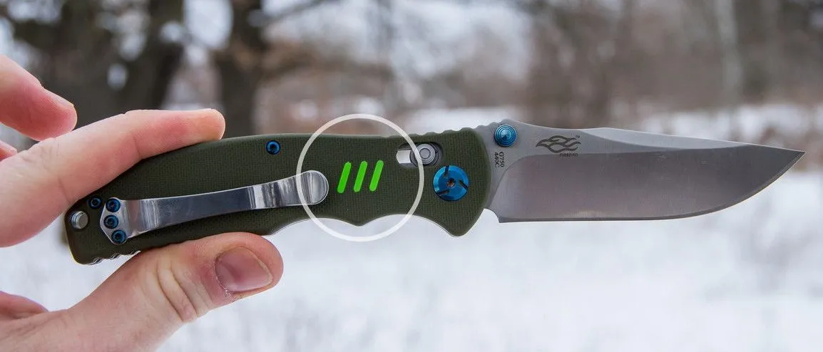 Некоторые модели Ganzo также могут иметь в рукояти специальные светонакопительные вставки (чаще всего зеленого цвета), которые позволяют быстрой найти нож среди прочего снаряжения или в условиях недостаточной освещенности.