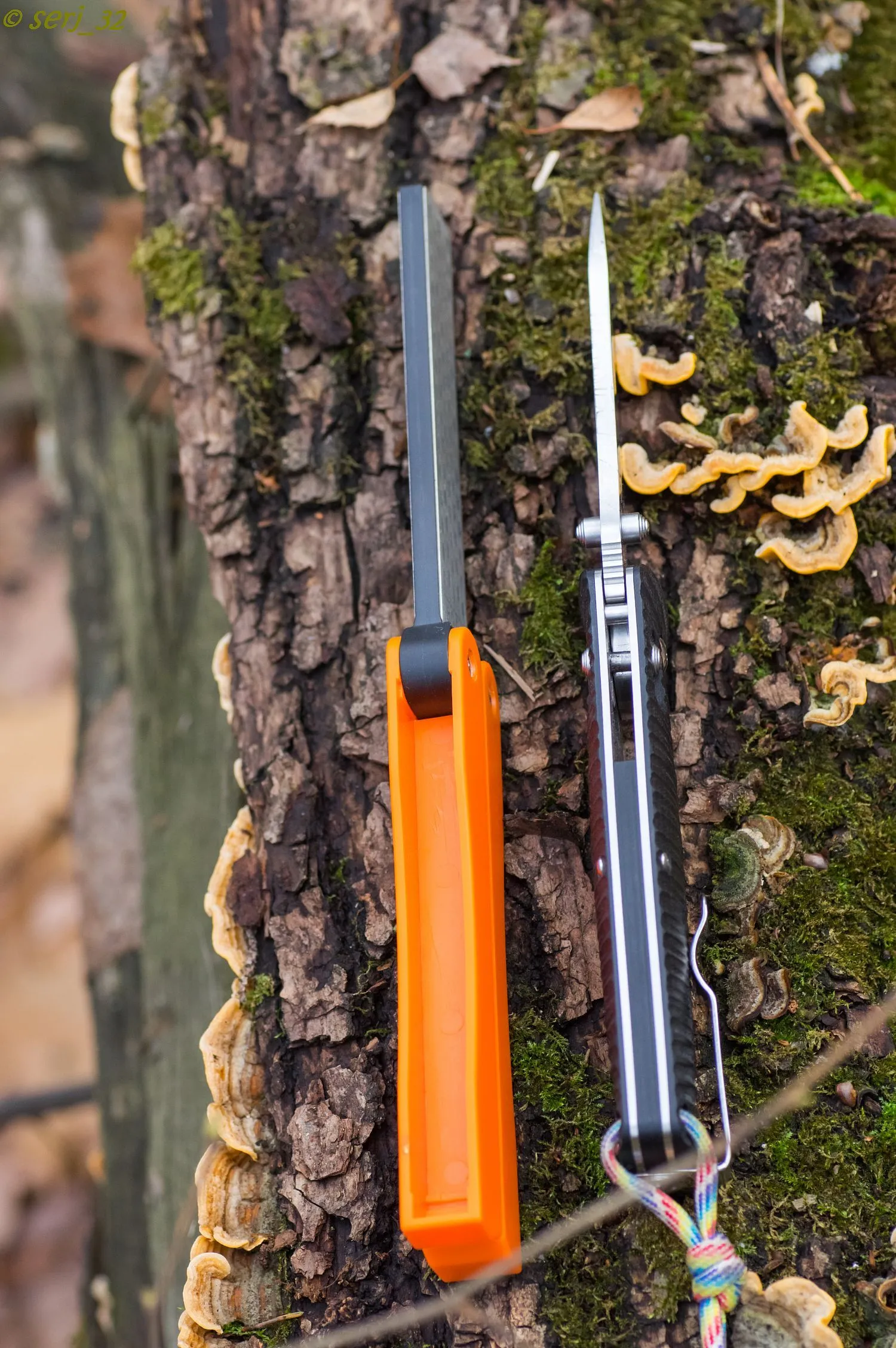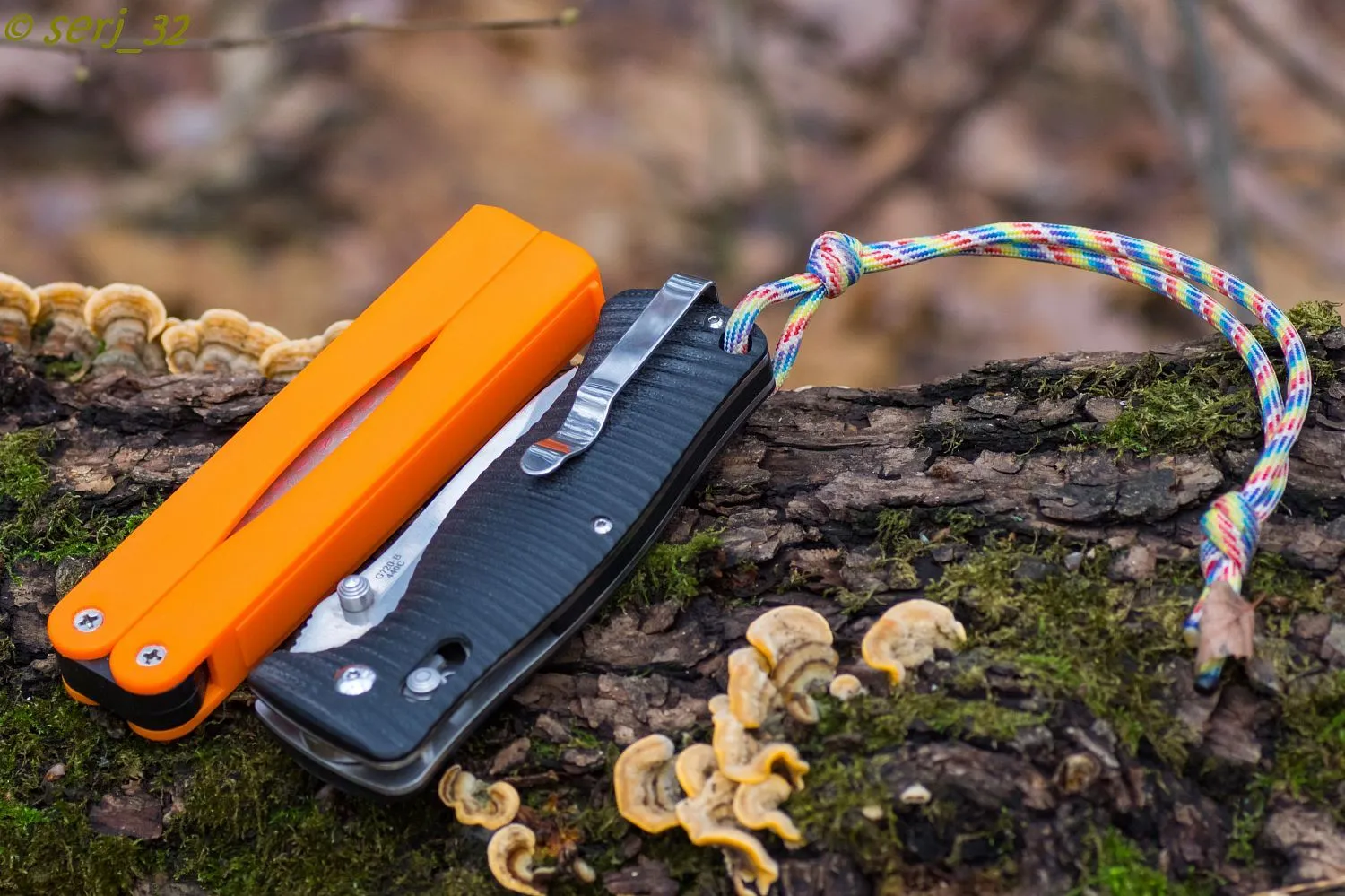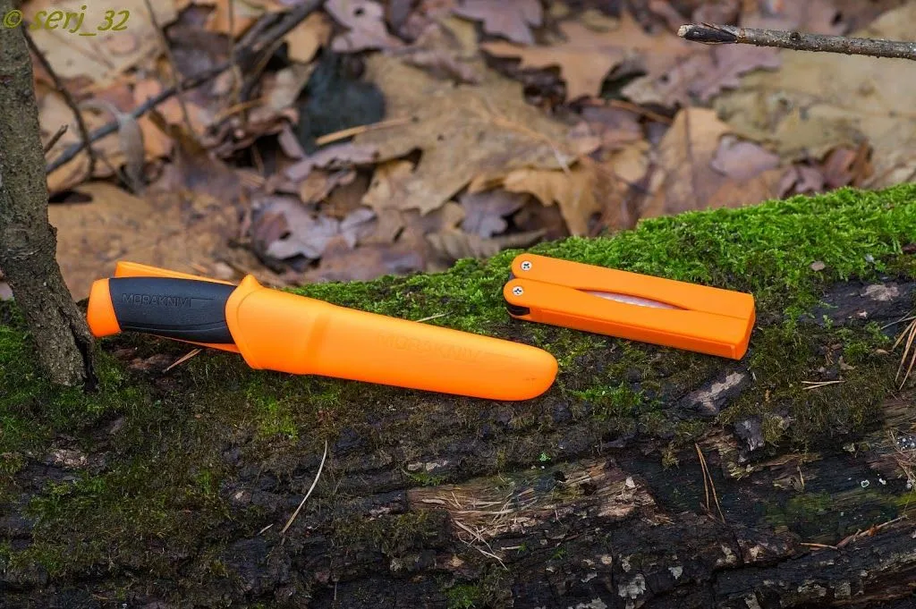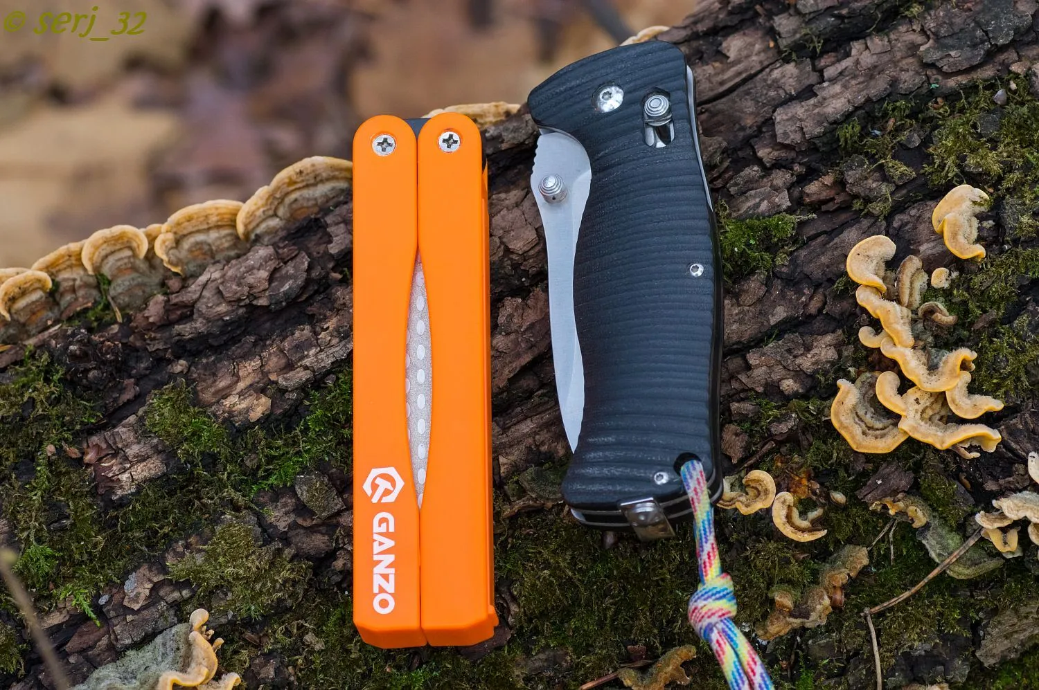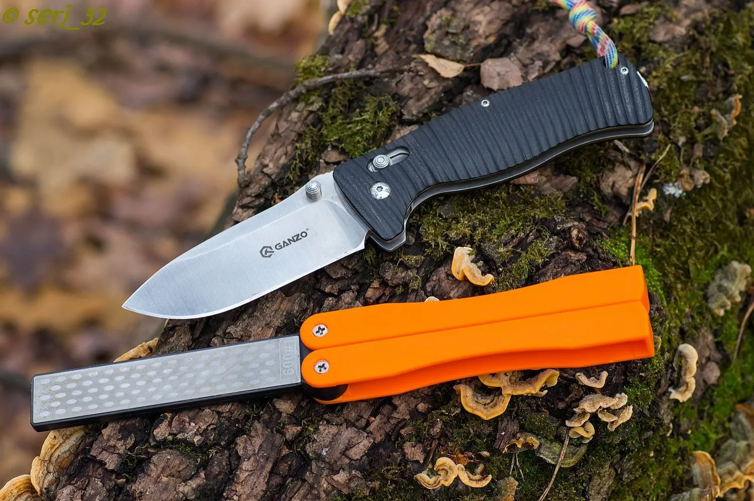 Конструктивно брусок похож на нож «бабочка»: складная конструкция, где брусок в транспортном положении спрятан между рукоятками. Рукоятки выполнены из пластика: не особо толстого, но если без фанатизма, то раздавить его в руках будет трудно. Цвет ручек - ярко-оранжевый, что уменьшает риск забыть или потерять точилку. По габаритам - 125х30х16 мм в сложенном виде и 288 мм в длину в раскрытом виде. В сложенном виде GANZO G506 не больше ножа, так что много места не занимает, а весит всего 62 грамма.