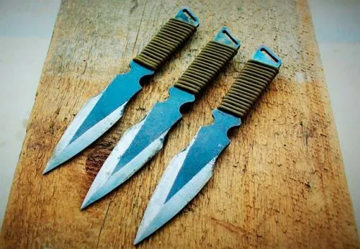- Количество ножей в комплекте . Выбирая метательные ножи, отдавайте предпочтение комплектам, состоящим из 3 или 5 штук. Это связано с тем, что для обучения метанию рекомендуется метать несколько ножей подряд с небольшой паузой между каждым броском. А вот при покупке одного ножа вам после броска придётся идти и искать его, затем снова становиться в исходную позицию и метать. Таким образом, вы потеряете очень много времени только на поиск упавшего ножа. Брать комплекты ножей, состоящие более чем из 5 штук не стоит, так как при среднем весе в 200 грамм, этот элемент снаряжения станет неудобным в транспортировке.