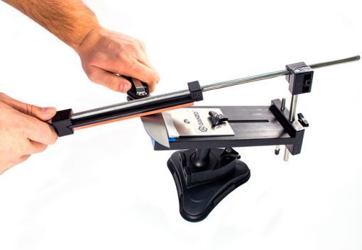Для сборки точильной системы, нужно прикрутить к основанию присоску. Собирается все легко, можно очень сильно не затягивать. Перед креплением присоску лучше смочить водой — так она будет держаться крепче. После этого, устанавливаем точилку на выбранной поверхности и прижимаем ее специальным рычагом. Сверху на основание устанавливается направляющая для заточки, на которой есть цветные отметки, обозначающие угол затачивания. Они помогают подобрать нужный угол в соответствии с назначением ножа.