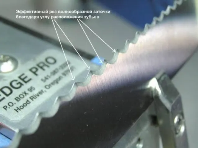 Клинок с серрейторной заточкой (когда он имеет волнообразную форму, зазубренный) все чаще встречается у производителей ножей. Больше предназначены для реза. Строгать им, например, будет проблематично. Особенно хорошо серрейторы справляются с вязкими, волокнистыми, слоистыми материалами: веревками, канатами, корнями растений и пр., ведь рез в этом случае происходит сразу под несколькими углами.