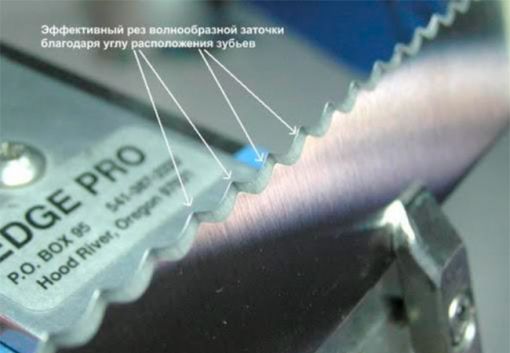Главная особенность “волнистых” лезвий – их проникающая способность. Глубина реза значительно усиливается за счет чередования острых и скругленных зубьев. Острые зубья практически прокалывают поверхность, упрощая проникновение в материалы с различной структурой. Немалую популярность этот тип заточки получил в изготовлении кухонных ножей. Такие инструменты лучше справляются с мягкими продуктами с твердой оболочкой: свежим хлебом, помидорами и т.д.