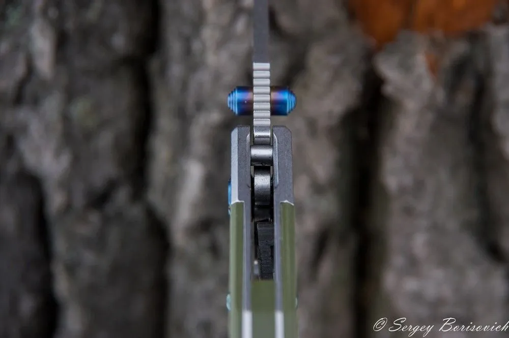 По-хорошему, флипер должен дополняться пружинкой призванной помочь ножу открыться. Здесь нет такой пружинки и клинок по оси ходит немного туго (на оси латунная и фторопластовая шайбы). Если наловчиться, то открыть нож флипером можно, задав начальный толчок лезвию, а потом - помочь взмахом руки.