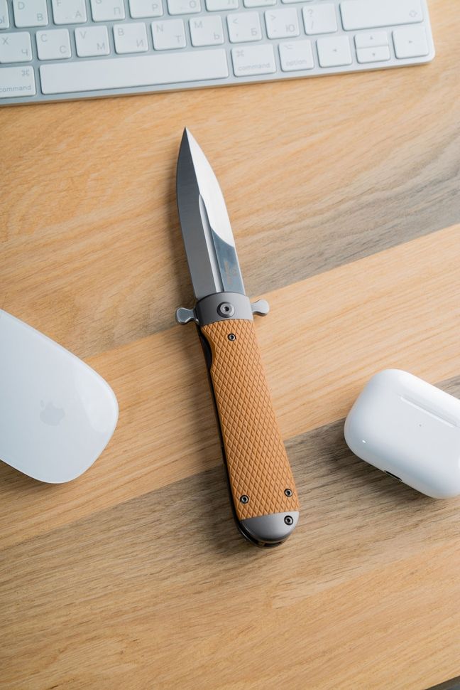 Клинок имеет форму Spear-Point с фальшлезвием со стороны обуха. С такой копьевидной формой легко выполнять колющую работу, когда нужно что-то подковырнуть, наколоть или тонко надрезать. С базовым задачами клинок эффективно справляется за счет своей длины в 94 миллиметра и толщины, составляющей 3.5 миллиметра.