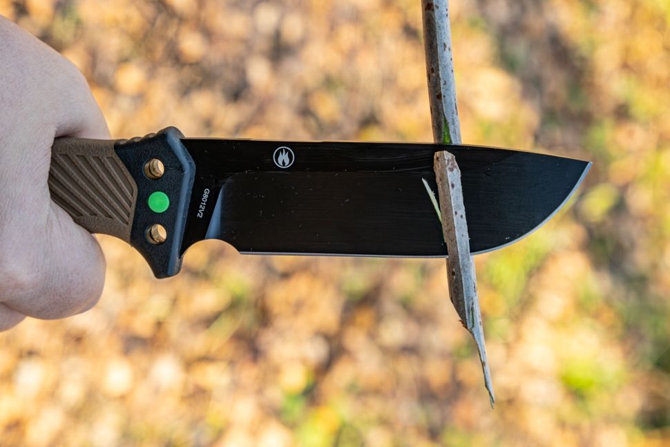 Модель G8012V2-DY продумана с учетом специфики ножей для использования на природе. Лезвие изготовлено из высокоуглеродистой стали 8CR13, которая устойчива к появлению коррозионного налета при длительном воздействии влаги и обеспечивает качественный рез. Твердость стали достигает отметки 58 HRC — оптимальное значение, при котором клинок легко затачивается и надолго сохраняет остроту режущей кромки. Длина клинка составляет 11.3 сантиметра, а толщина — 5 миллиметров, что гарантирует повышенную прочность ножа и исключает вероятность появления сколов. Поверхность лезвия имеет черное матовое покрытие, которое отличается стойкостью и является отличительной чертой модели.