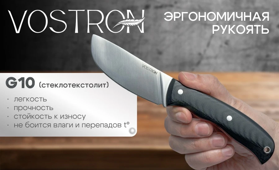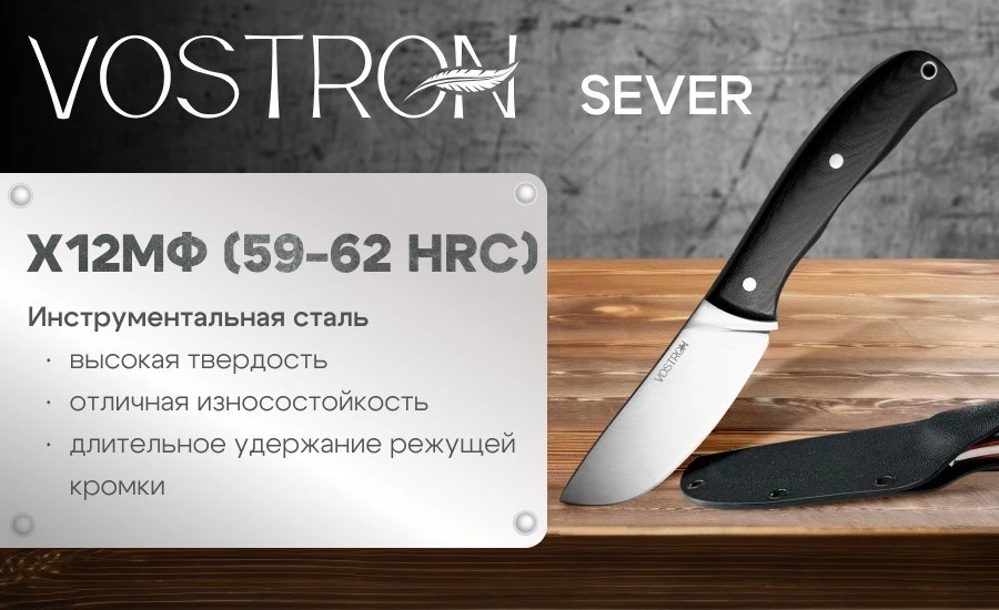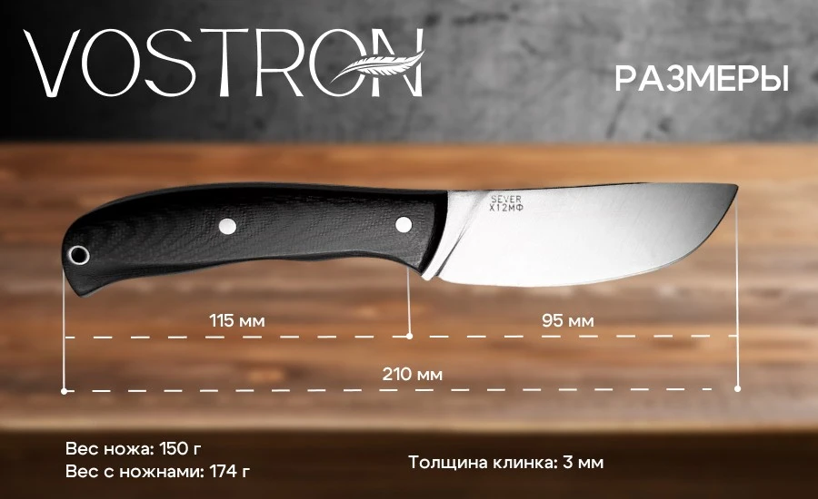 Vostron Sever — фиксированный нож, идеально подходящий для туризма. Клинок ножа выполнен из прочной инструментальной стали Х12МФ, рукоять — из стеклотекстолита G10. Общая длина ножа — 210 мм, вес — 150 г. В комплекте предусмотрены удобные ножны, которые позволяет безопасно хранить и носить нож.
