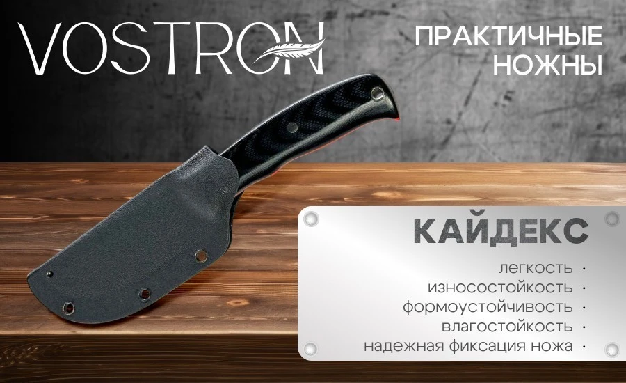Для удобного и безопасного хранения в комплекте предусмотрены ножны из кайдекса. Кайдекс обладает высокой прочностью, гибкостью, износостойкостью и влагостойкостью, что делает его отличным материалом для ножен. Поверхность ножен легко очищается и не требует сложного ухода.