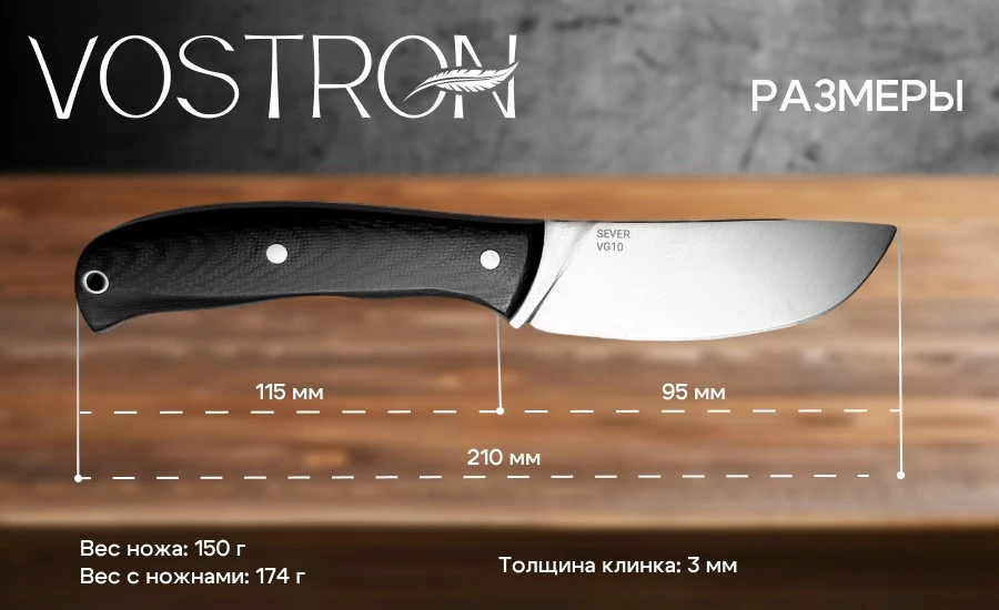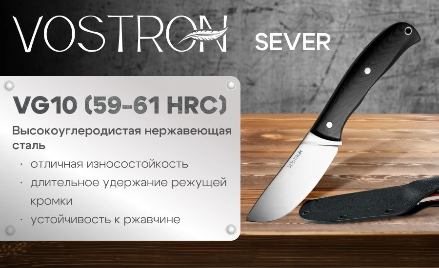Vostron Sever — фиксированный нож, идеально подходящий для туризма. Клинок ножа выполнен из прочной инструментальной стали VG10, рукоять — из стеклотекстолита G10. Общая длина ножа — 210 мм, вес — 150 г. В комплекте предусмотрены удобные ножны, которые позволяет безопасно хранить и носить нож.
