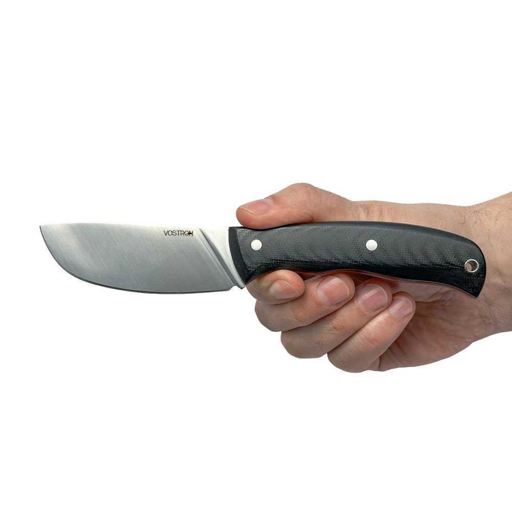 Vostron Sever — фиксированный нож, идеально подходящий для туризма. Клинок ножа выполнен из прочной инструментальной стали VG10, рукоять — из стеклотекстолита G10. Общая длина ножа — 210 мм, вес — 150 г. В комплекте предусмотрены удобные ножны, которые позволяет безопасно хранить и носить нож.