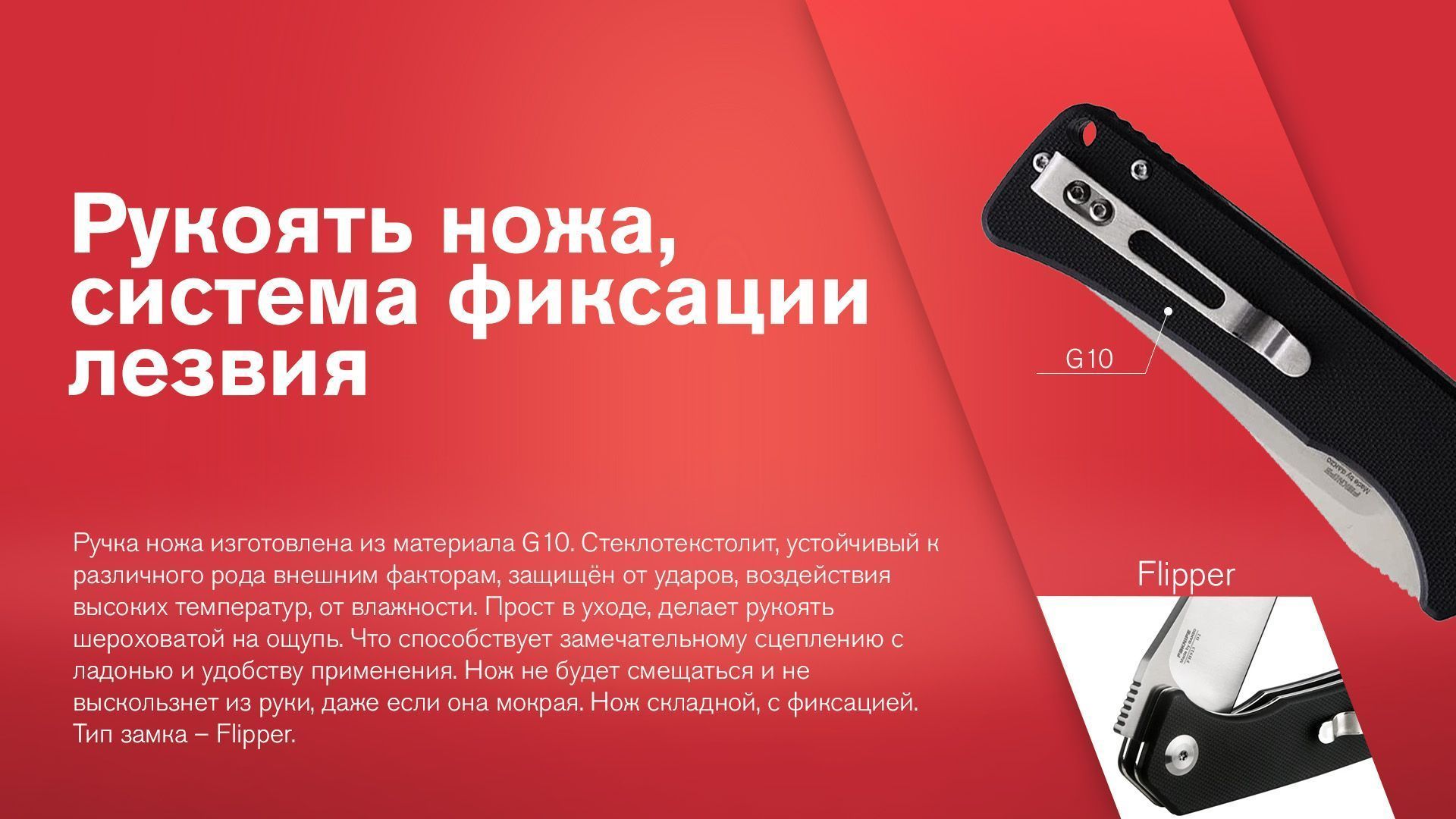 Нож складной, с фиксацией. Тип замка – Flipper. Прекрасная механика, запросто раскрывается и закрывается, безопасен в эксплуатации.